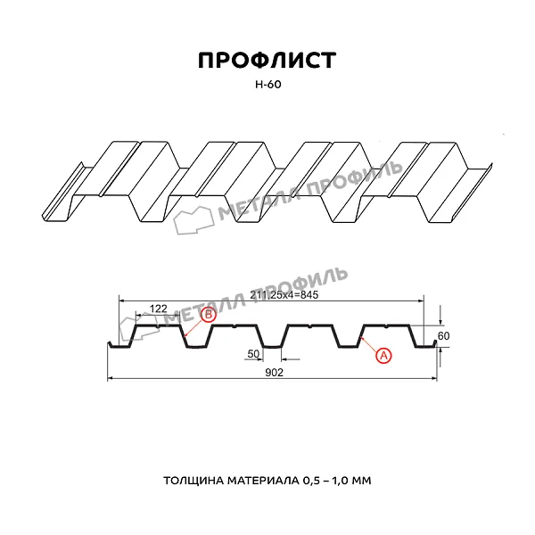 Профлист МЕТАЛЛ ПРОФИЛЬ Н-60х845-A (VikingMP E-20-8017-0,5) широко применяется для обустройства профилированного листа. Изначально он представляет собой лист оцинкованной стали с покрытием. Толщина стальной основы с оцинковкой и полимерным слоем — 0.5 мм. После проката на специальном оборудовании металл приобретает рисунок из ритмичных волн. Несущая способность такого листа гораздо выше плоского.